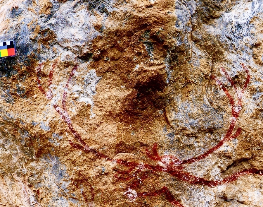 圖為2023年6月24日拍攝的甘孜州“海子山-格聶巖畫群”海1巖畫中獨(dú)特的野豬、人物、爪印圖像