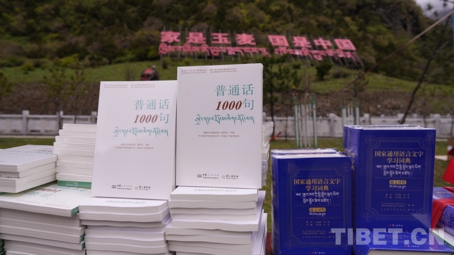 圖為《普通話1000句》漢藏對(duì)照版、《國(guó)家通用語(yǔ)言文字學(xué)習(xí)詞典》(藏文對(duì)照)等書(shū)籍