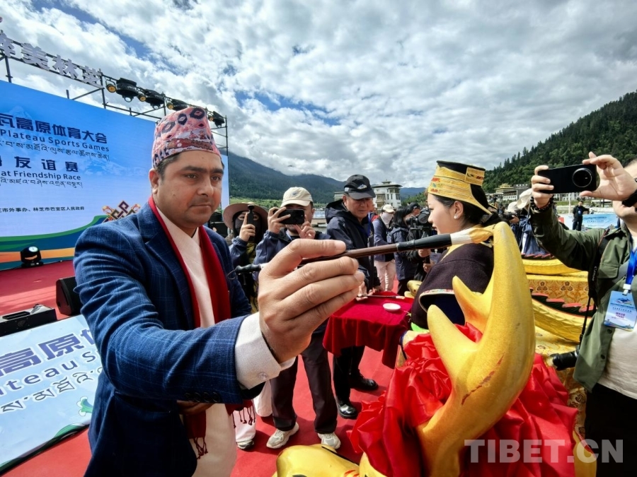 6月15日,14支國(guó)內(nèi)外隊(duì)伍參加2025年西藏林芝南迦巴瓦高原體育大會(huì)——中尼高原龍舟友誼賽。圖為尼泊爾代表為龍點(diǎn)睛 攝影:王淑