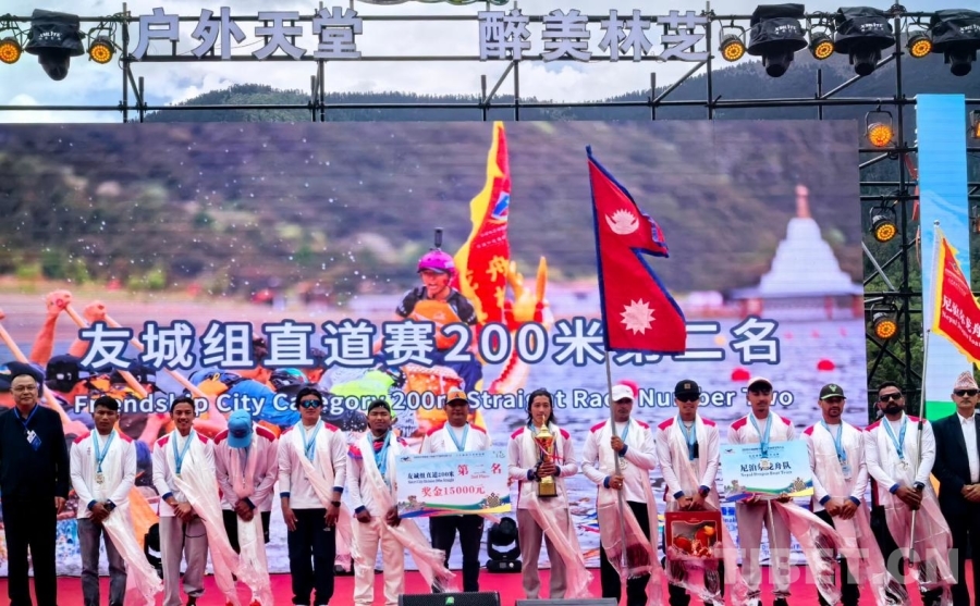 6月15日,14支國(guó)內(nèi)外隊(duì)伍參加2025年西藏林芝南迦巴瓦高原體育大會(huì)——中尼高原龍舟友誼賽。圖為尼泊爾隊(duì)獲得友城組直道賽200米第二名 攝影:王淑