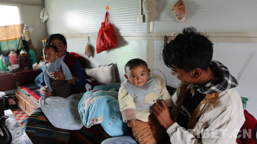 圖為旦增點(diǎn)旦回到板房照看小孩