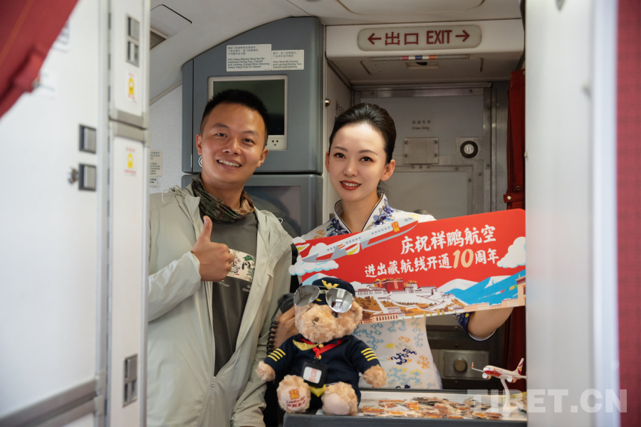 在當天從喀什飛往阿里的航班上,祥鵬航空策劃開展了主題活動,慶祝航線開通10周年以及西藏自治區(qū)成立60周年。搭乘航班的每位旅客均收到了潔白的哈達;有獎問答環(huán)節(jié)氣氛熱烈,客艙內笑聲與掌聲此起彼伏;旅客分享的自己與高原的故事,更令不少人動容。航班在祝福、歡樂與感動中飛向雪域高原。