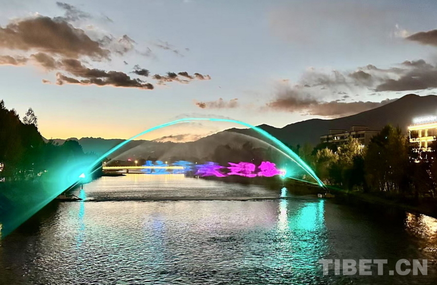 圖為拉薩兩島內(nèi)河綠色生態(tài)廊道提升工程新建的水幕電影在傍晚時(shí)分亮起 拉薩市水利局供圖