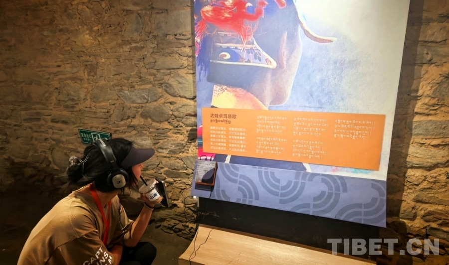圖為游客參觀強(qiáng)吉莊園公共文化活動(dòng)中心時(shí)通過影音設(shè)備聆聽歌曲《達(dá)娃卓瑪悲歌》 攝影:劉莉