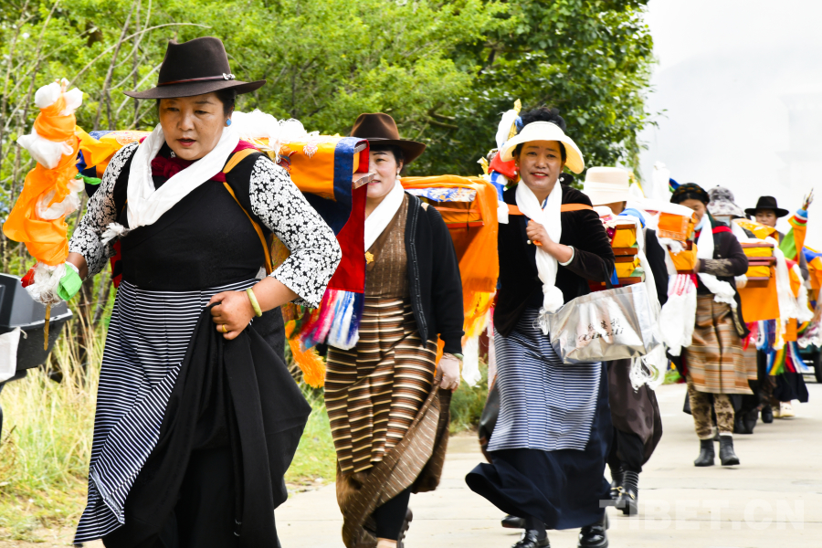 中國西藏網(wǎng)訊 望果節(jié),是流行于西藏的傳統(tǒng)民俗,國家級非物質文化遺產(chǎn)之一?!巴笔侵盖f稼,藏語叫“望卡”或“興卡”,“果”是轉圈的意思,即繞著豐收在望的莊稼轉圈,是西藏農(nóng)區(qū)歡慶豐收的民俗。7月28日,在西藏自治區(qū)拉薩市曲水縣才納鄉(xiāng),村民們身著新裝、手提大小飯盒,背上還背著酥油茶和青稞酒,開始望果節(jié)第一日的轉田游行,感謝大自然給人們帶來了風調雨順的好年景。(中國西藏網(wǎng) 記者/趙振宇)