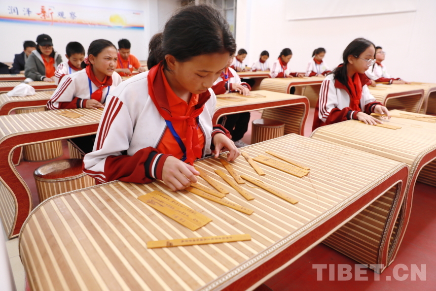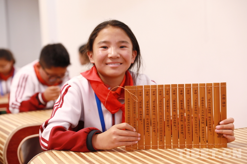“子曰:‘學(xué)而不思則罔,思而不學(xué)則殆?!娰t思齊焉,見不賢而內(nèi)自省也?!卟换?,仁者不憂,勇者不懼。’……”竹簡手工課堂上,孩子們將打磨光滑的刻字竹片用牛筋線仔細(xì)編連成冊?!巴瑢W(xué)們要記住,繩子折疊后要保持長度一致,位于竹簡上方的繩子向上穿孔,下面的繩子向下穿孔而過,這樣能保證竹片緊密相連,即‘上上下下’原則?!痹诶蠋熛ば牡闹笇?dǎo)與幫助下,孩子們稚嫩的雙手上下翻飛,很快便將散落的竹簡按照刻字排列整齊,并編織成冊。來自阿里噶爾縣昆莎鄉(xiāng)的巴桑卓瑪說道:“編竹簡需要繩子不斷交織,與藏族的紡織工藝有些相似。通過這次手工,我感受到了古人的智慧與中國傳統(tǒng)文化的神奇奧秘?!闭窍裰窈?、紙張一樣的文化載體,才讓先賢哲人的深邃智慧以文字的形式流傳至今,被千年后的人們傳承誦讀。