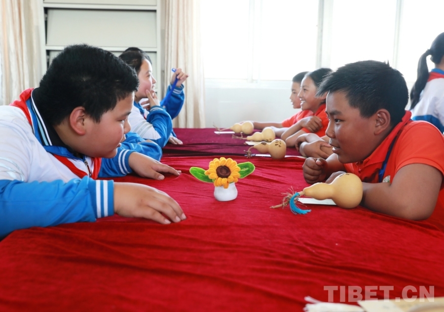 圖為山東聊城堂邑鎮(zhèn)中心小學(xué)學(xué)生向西藏阿里噶爾縣孔繁森小學(xué)的小伙伴贈送并介紹媽媽親手制作的向日葵小擺件 攝影:劉莉