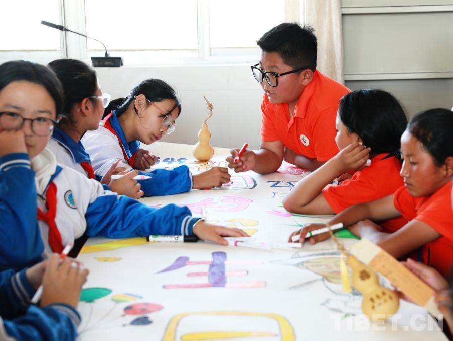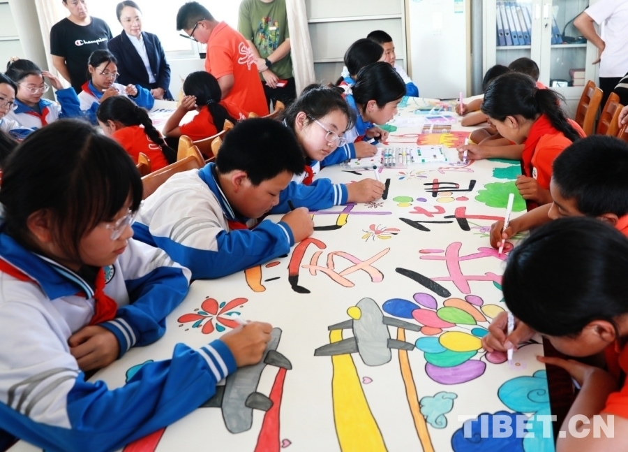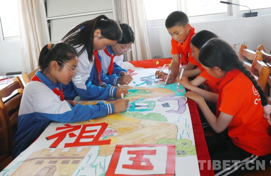 圖為西藏阿里噶爾縣孔繁森小學(xué)、山東聊城堂邑鎮(zhèn)中心小學(xué)的孩子們共同創(chuàng)作迎國慶主題畫卷 攝影:劉莉