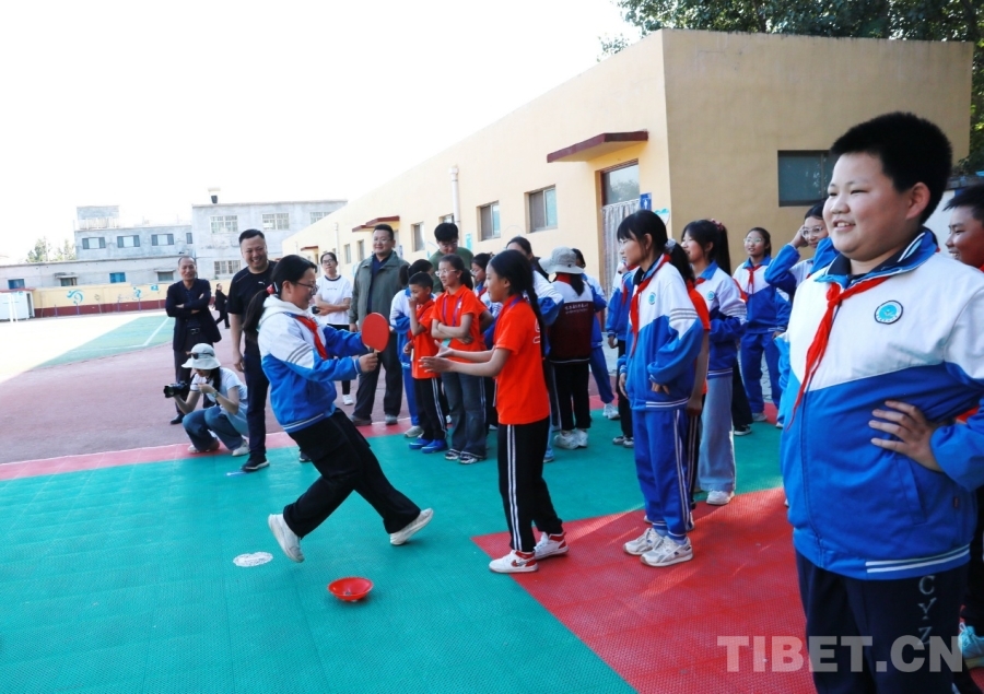 圖為西藏阿里噶爾縣孔繁森小學(xué)、山東聊城堂邑鎮(zhèn)中心小學(xué)的孩子們一起參與接力游戲 攝影:劉莉