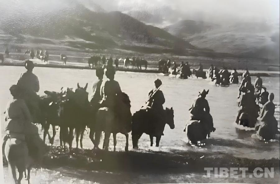 圖為1952年,米福堂精心組織力量,幫助十世班禪和護(hù)送部隊(duì)在通天河七渡口渡過長江