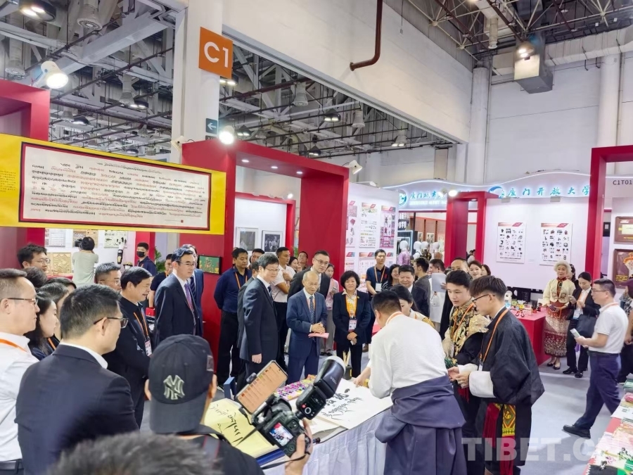 圖為西藏民族大學(xué)扎西曲吉參加第十六屆海峽兩岸(廈門)文化產(chǎn)業(yè)博覽交易會,現(xiàn)場書寫“團結(jié)統(tǒng)一”的漢藏雙語書法作品并做講解