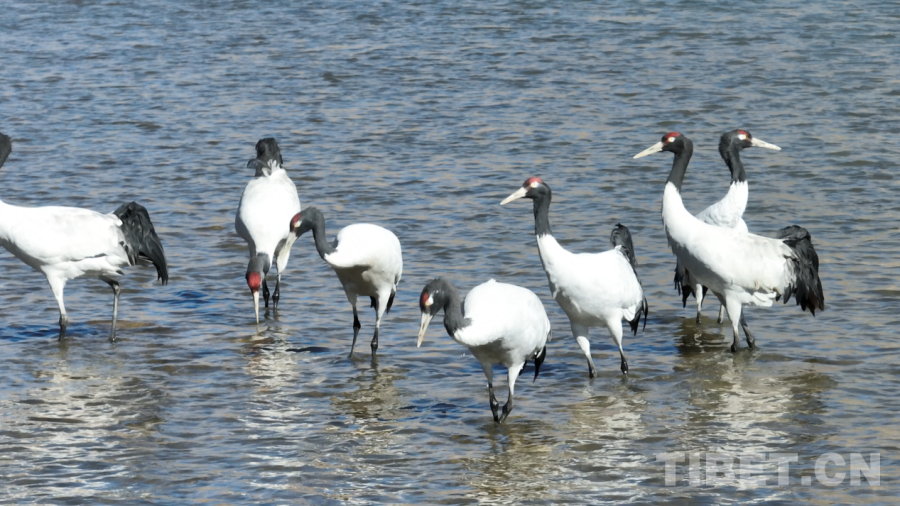 在南木林縣艾瑪鄉(xiāng)周邊,不少黑頸鶴陸續(xù)抵達并集群棲息,為越冬積蓄能量。它們或在河畔低頭啄食,或閑庭信步梳理羽翅,時而振翅舒展身姿。