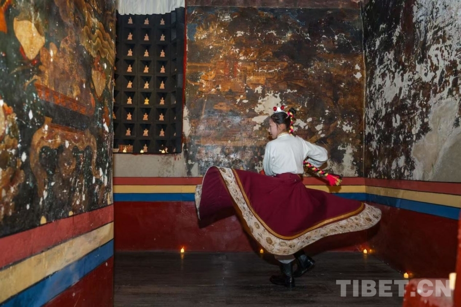 吉本崗藝術(shù)中心作為西藏首座經(jīng)保護(hù)性改造而成的公共文化空間,前身為19世紀(jì)古建——吉崩崗拉康。其獨(dú)特的立體壇城結(jié)構(gòu)、珍貴的《香巴拉之戰(zhàn)》清代愛國(guó)主義壁畫等文化遺產(chǎn),為此次非遺展演提供了深厚的歷史背景與空間底蘊(yùn)。活動(dòng)創(chuàng)新采用“雙回字形”沉浸式布局,將古建外廊的常設(shè)展與內(nèi)廊當(dāng)代藝術(shù)展巧妙結(jié)合,設(shè)立八個(gè)固定表演點(diǎn)位。觀眾以“循環(huán)觀演+自由漫游”的方式穿梭其間,在移步換景中感受非遺技藝與當(dāng)代藝術(shù)的交融共鳴,實(shí)現(xiàn)“空間、非遺與新生”的和諧共振。