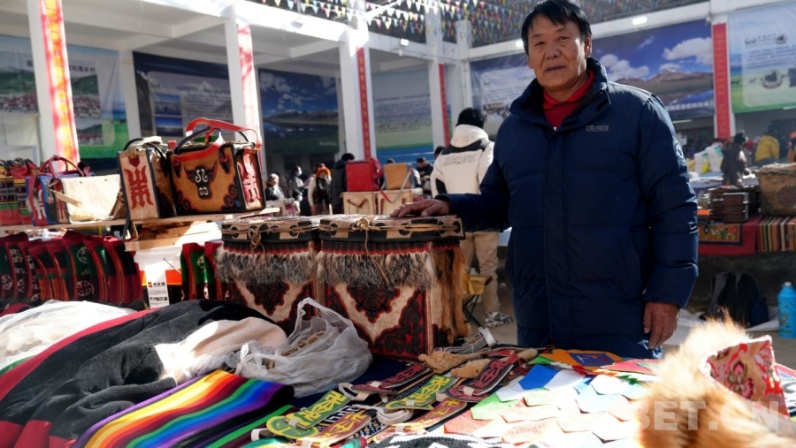 圖為巴青縣阿秀鄉(xiāng)三村村民彭措在自家展臺前留影