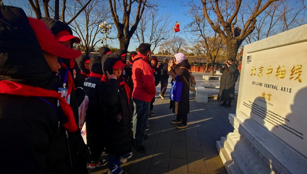 圖為西藏自治區(qū)那曲市色尼區(qū)青少年足球隊赴京研學(xué)團一行在了解被列入《世界遺產(chǎn)名錄》的北京中軸線 攝影:劉莉