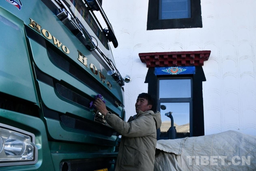 圖為旦增杰布正在新家前擦拭自己的新車 攝影:趙振宇
