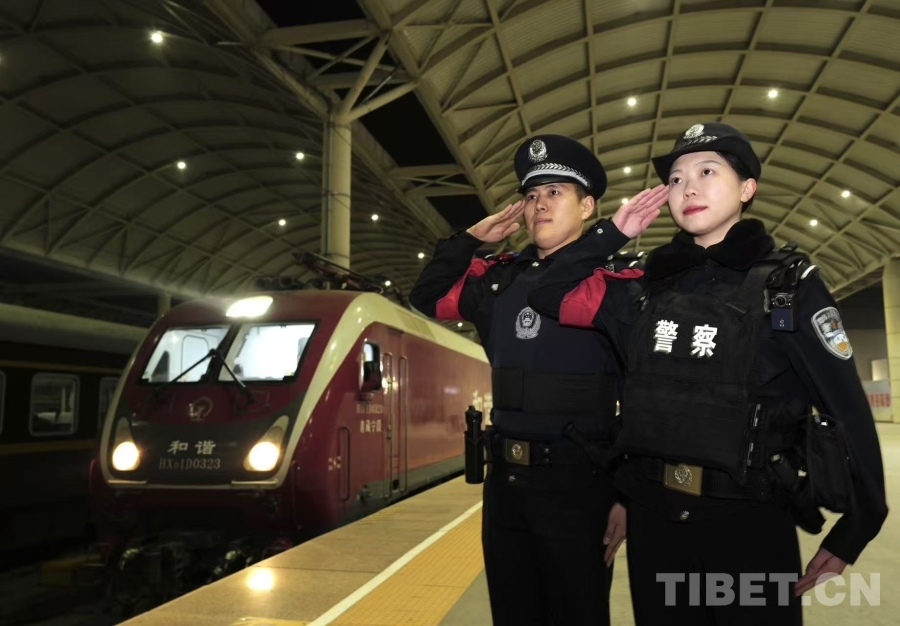 2月2日凌晨時分,隨著清脆的火車汽笛聲響起,西寧鐵路公安處春運的大幕正式拉開。圖為站臺上,民警莊嚴(yán)敬禮,目送滿載旅客的列車緩緩啟程。