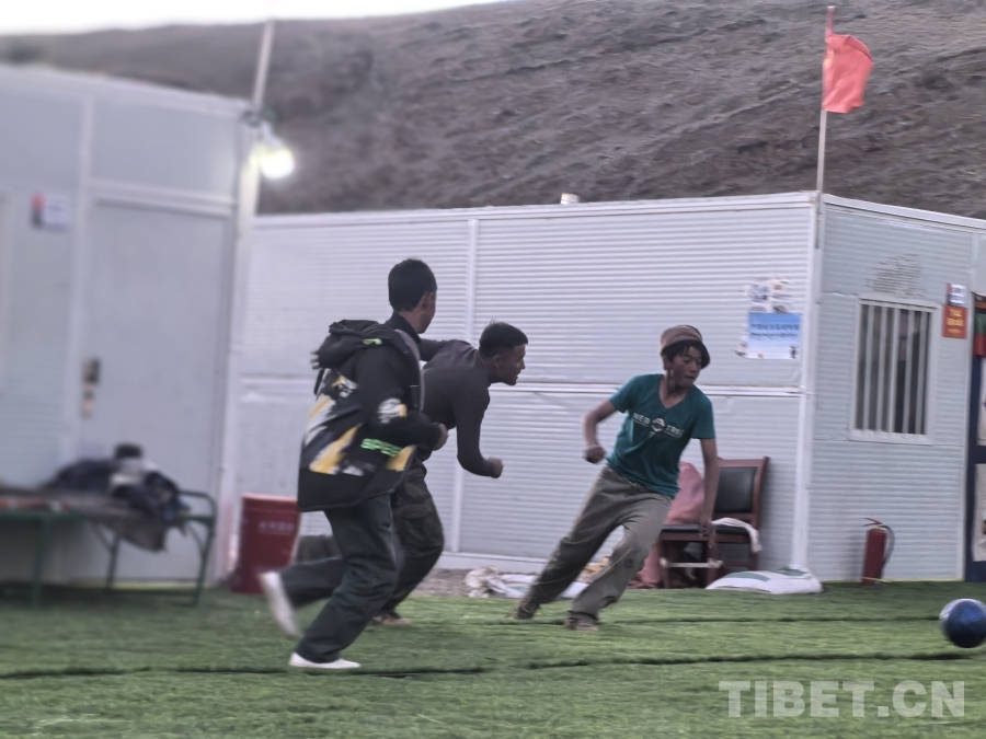 圖為少年們?cè)谂R時(shí)安置點(diǎn)的板房間踢足球 攝影:陳明(攝于2025年)
