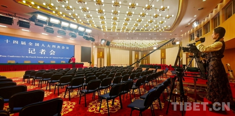 中國西藏網(wǎng)記者正在拍攝2026年全國兩會(huì)新聞中心工作人員布置新聞發(fā)布廳 攝影:劉莉