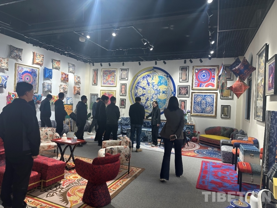 依文集團(tuán)工作人員向色尼區(qū)考察團(tuán)介紹旗下手工作品