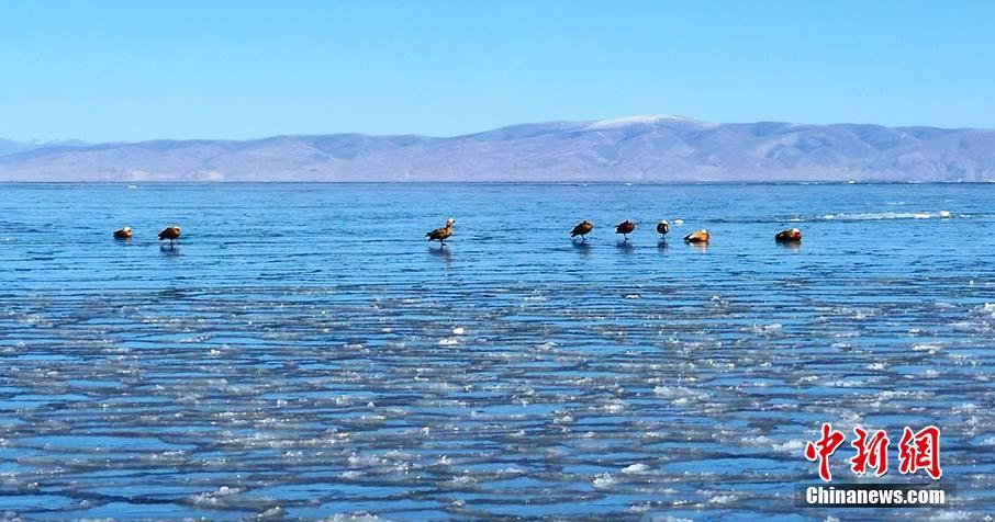 圖為野生鳥(niǎo)類(lèi)在冰面上嬉戲。趙海梅 攝