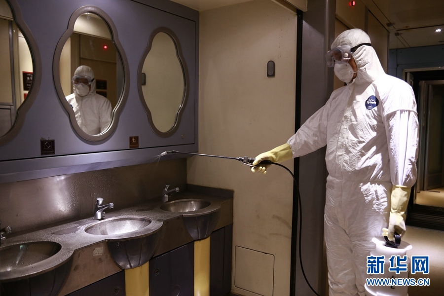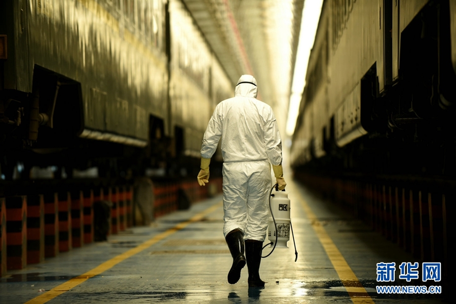 工作人員對每一列旅客列車進行消毒作業(yè)。新華網(wǎng) 郝寶君 攝