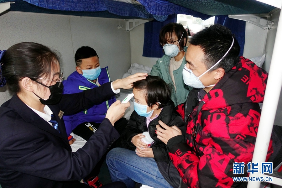 西寧客運段職工為旅客測量體溫。新華網(wǎng) 郝寶君 攝