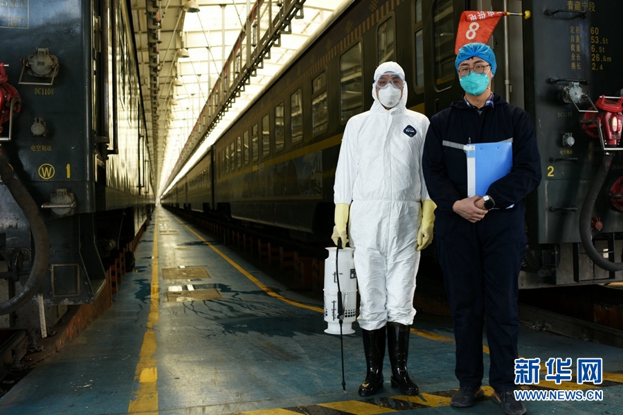 在西寧車輛段車庫內(nèi),防疫人員對每列旅客列車進行全面殺毒。新華網(wǎng) 李俊 攝