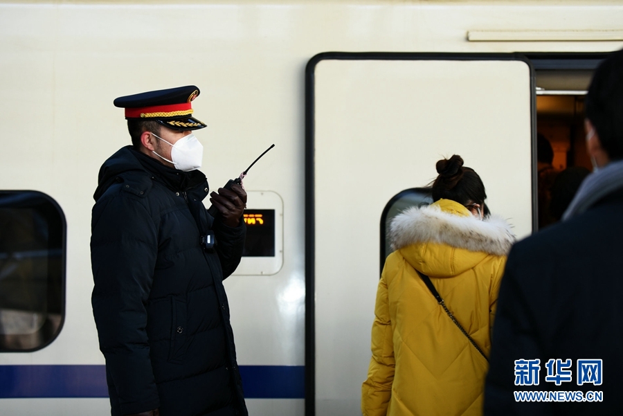 工作人員引導旅客乘坐列車。新華網(wǎng) 李俊 攝