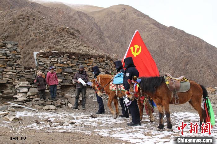 圖為馬背巡邏隊(duì)在轄區(qū)內(nèi)為牧民贈(zèng)送口罩、發(fā)放藏漢雙語(yǔ)宣傳資料?!≡魈m周 攝