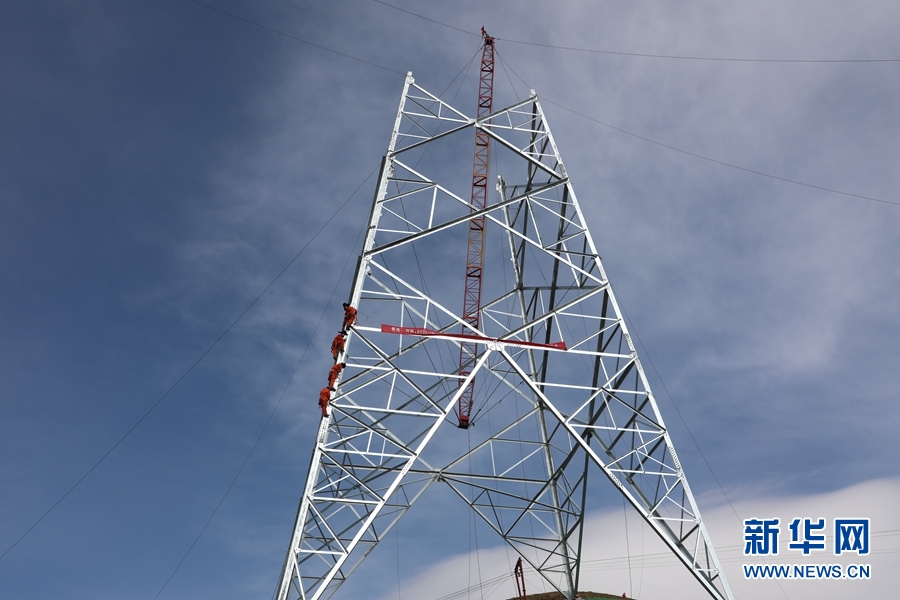 青海-河南±800千伏特高壓工程青2標(biāo)復(fù)工現(xiàn)場(chǎng),施工人員進(jìn)行組塔作業(yè)。新華網(wǎng) 鄒建華 攝