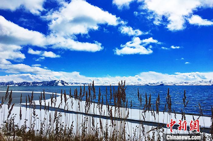 2018年10月14日在青海省瑪多縣拍攝的雪后黃河源頭的湖泊在藍(lán)天的照映下,如同寶石一般。中新社記者 孫睿 攝