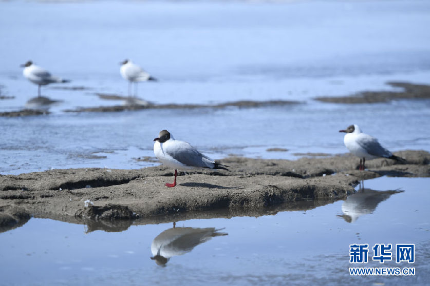 這是4月8日在青海省海北藏族自治州剛察縣青海湖畔拍攝的棕頭鷗。新華社記者 張龍 攝
