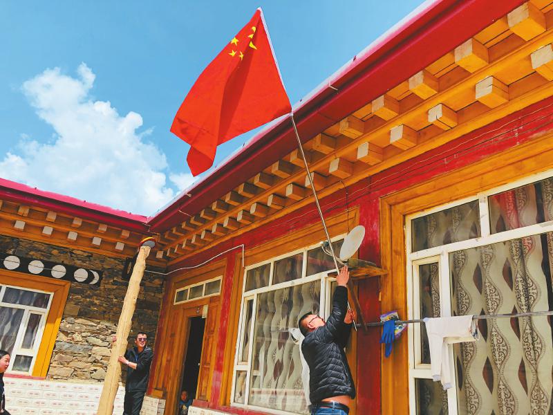 5月22日一早,在海拔3200多米的四川省阿壩州壤塘縣崗木達鄉(xiāng)達日村,村民白洛一起床,就爬到新建的藏式民房房頂掛上了一面國旗?!吧钤竭^越好了。”過去,白洛一家以放牧和挖藥材為生,勉強糊口。如今,依靠國家扶貧好政策和社會各界的幫扶,村里建起了中藥材基地,白洛也實現(xiàn)了就近就業(yè),家庭年收入達1.3萬元,擺脫了貧困。她說,掛上國旗,是想對著國旗說上幾句感謝的心里話。
