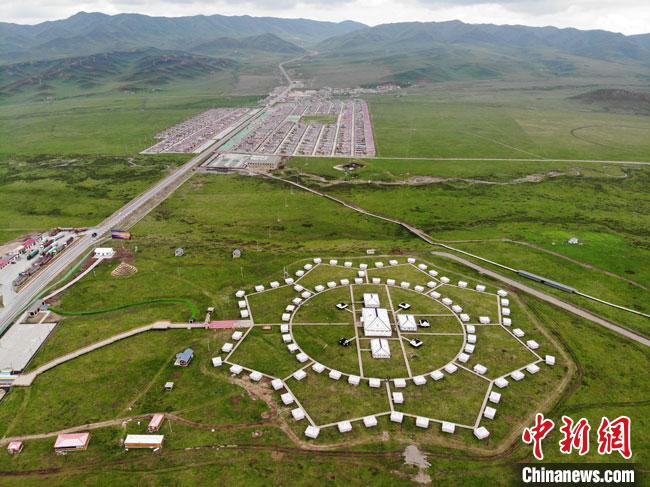 尕秀村的帳篷城由108頂大小各異的藏式風(fēng)格帳篷組成。空中俯瞰,一頂頂帳篷如同一顆顆璀璨的珍珠,點綴著曬銀灘草原的秀美。楊艷敏 攝