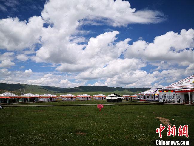 6月下旬,甘肅甘南藏族自治州碌曲縣尕海鎮(zhèn)境內(nèi)晴空萬里,湛藍(lán)的天空如同水洗過般通透明亮,輕薄如棉的云朵隨風(fēng)移動。被一碧萬頃的草原簇?fù)碇逆匦愦澹瑵M目皆是古老藏飾風(fēng)格與現(xiàn)代時尚的交織融合,吸引絡(luò)繹不絕的游人前來體驗“高原秘境”。