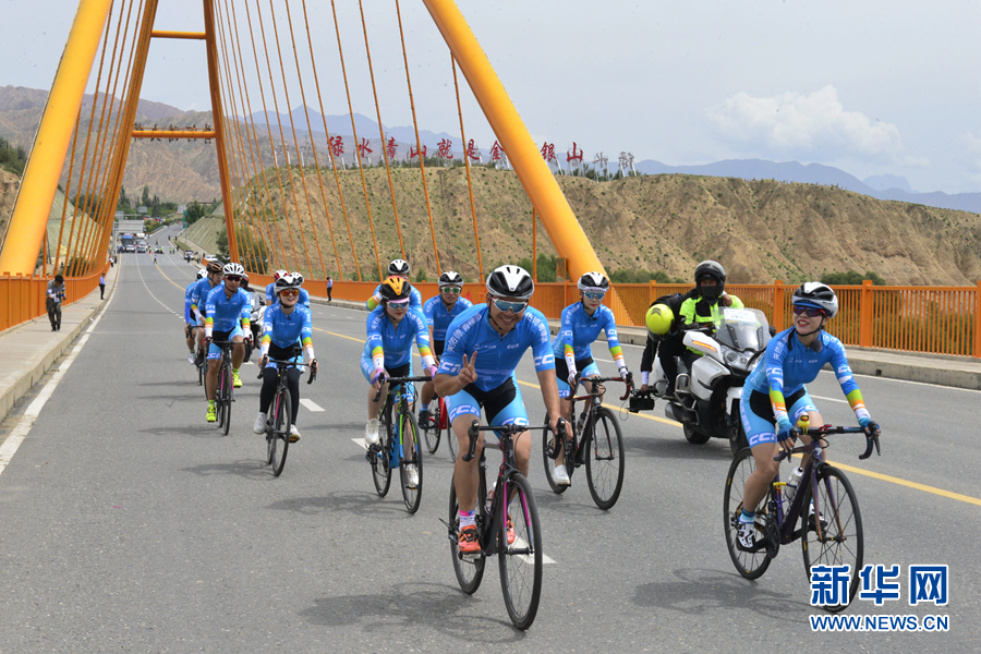 圖為“網(wǎng)紅”團隊在貴德黃河大橋上騎行。新華網(wǎng) 魚昊 攝