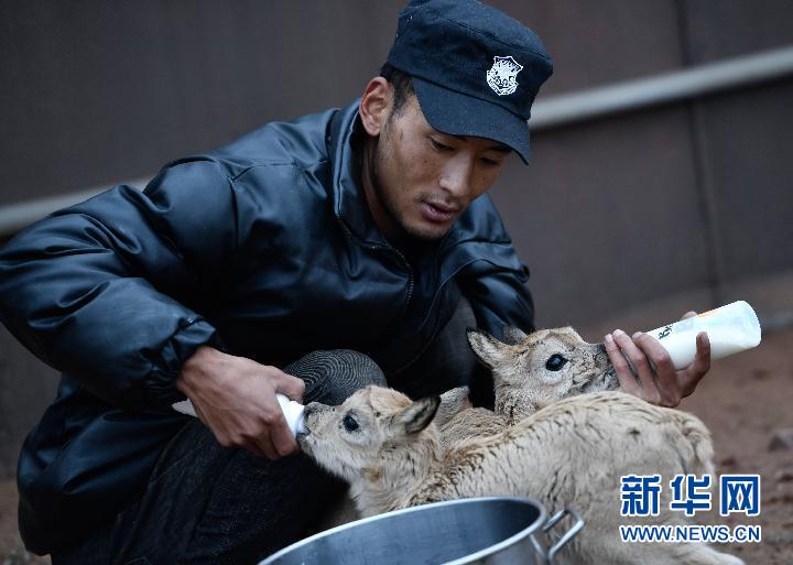 7月8日,三江源國(guó)家公園管理局長(zhǎng)江源園區(qū)可可西里管理處卓乃湖保護(hù)站的工作人員才文多杰在給藏羚羊幼仔喂奶。新華社記者 張龍 攝