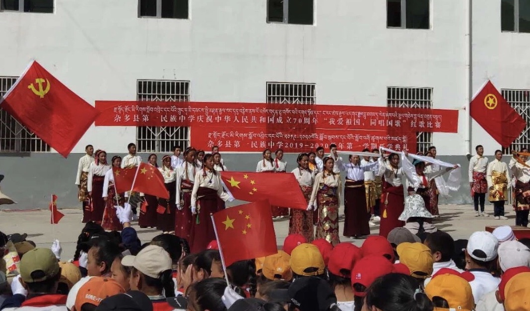雜多縣第一民族中學(xué)的學(xué)生正在參加“慶祝中華人民共和國(guó)成立70周年”歌唱比賽活動(dòng)。 本文受訪者供圖