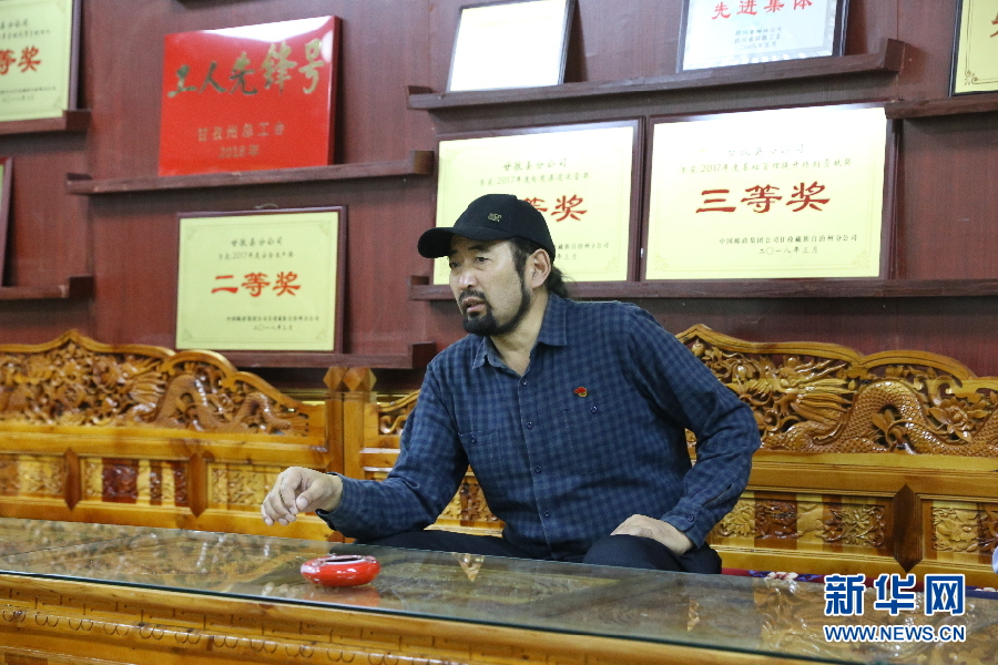 其美多吉接受采訪,背后的墻上掛滿他和集體的各項榮譽。新華網 曹鵬 攝