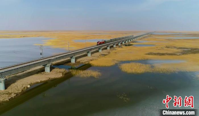 列車經過臺特瑪湖特大橋。若羌縣融媒體中心供圖