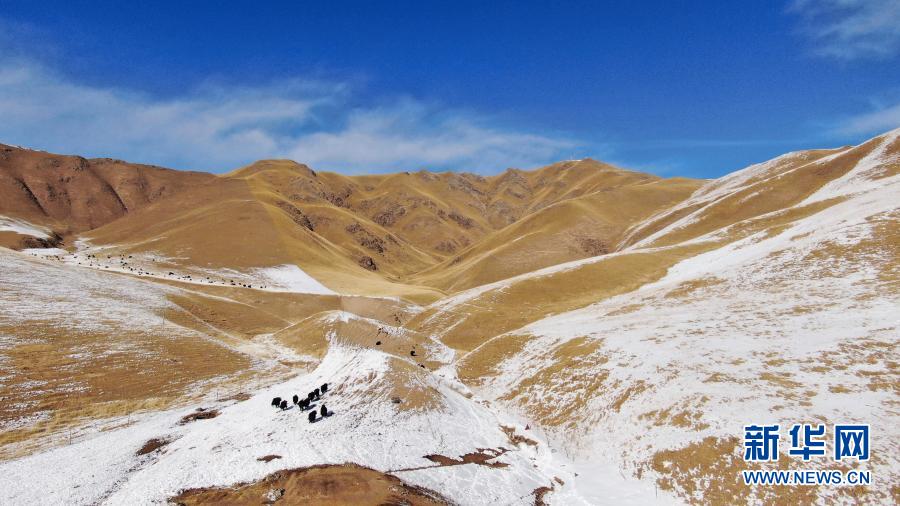 在青海省祁連縣,一群牦牛在雪后活動(12月7日攝,無人機(jī)照片)。新華社記者 張宏祥 攝