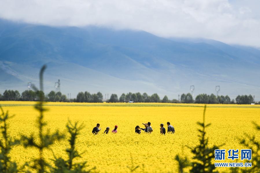 7月22日,游客在青海門源回族自治縣的油菜花田中拍照。新華社記者 吳剛 攝