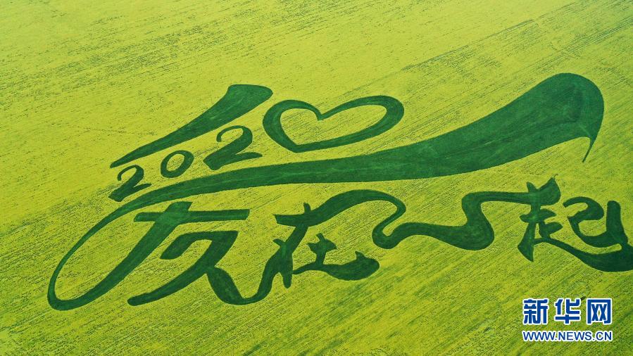 這是7月23日拍攝的青海門源回族自治縣的油菜花田拼出的“2020愛在一起”的圖案(無人機照片)。新華社記者 吳剛 攝
