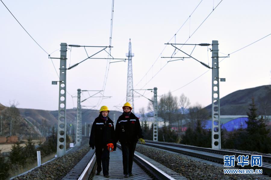 2月2日,在青藏鐵路公司西寧供電段哈爾蓋工區(qū)負(fù)責(zé)鐵路線上,郭勝?gòu)?qiáng)(左)與羅露露在巡檢接觸網(wǎng)。新華社記者 張龍 攝