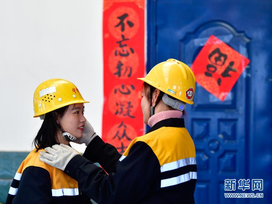 2月2日,在青藏鐵路公司西寧供電段哈爾蓋工區(qū),郭勝?gòu)?qiáng)(左)與羅露露在工作前互相檢查安全裝備。新華社記者 張龍 攝