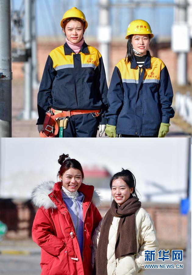 這是一張拼版照片,上圖為:羅露露(左)與郭勝?gòu)?qiáng)在工作前拍攝的合影(2月2日攝);下圖為:羅露露(左)與郭勝?gòu)?qiáng)在休息時(shí)拍攝的合影(2月2日攝)。新華社記者 張龍 攝