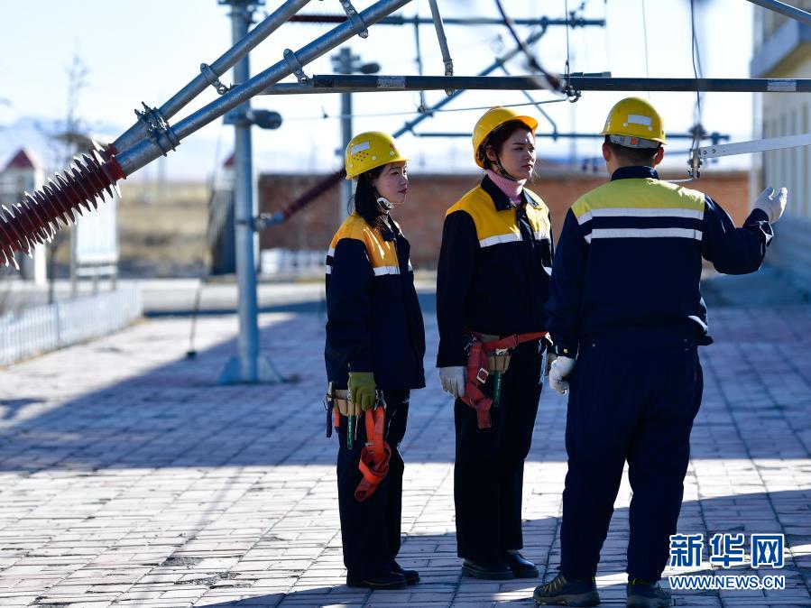 2月2日,在青藏鐵路公司西寧供電段哈爾蓋工區(qū),郭勝?gòu)?qiáng)(左)與羅露露(中)在聽老職工講解安全知識(shí)。 新華社記者 張龍 攝