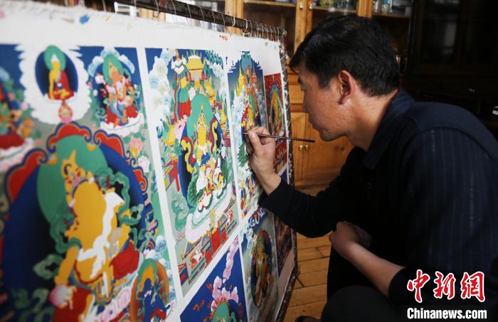 圖為印巴尖措畫唐卡。張?zhí)砀!z