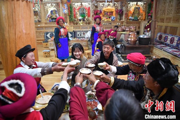 圖為格桑卓瑪與大家一起享豐盛的藏餐。中新社記者 劉冉陽 攝